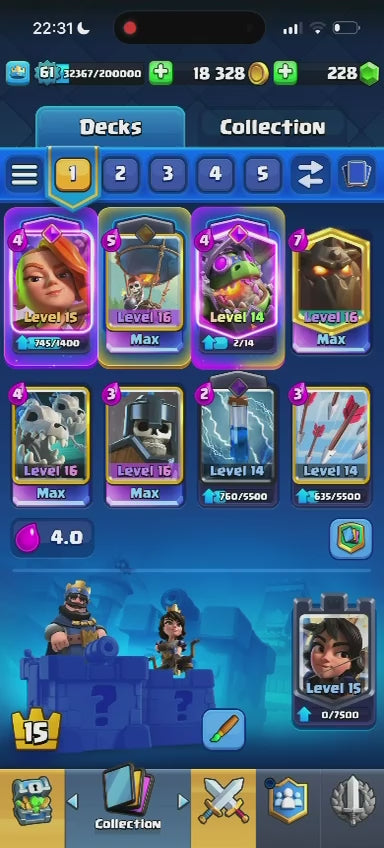 Clash Royale | Nível 61 | 18 Evoluções | 3 Heróis | 4 cartas 16 | 4 cartas 15 | 75 Emotes | (+011)